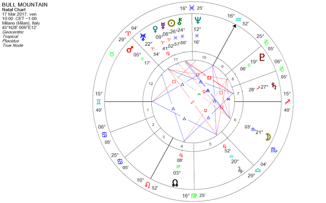 Il sole di Bull Mountain nello sregolato segno dei Pesci è quadrato precisamente a Saturno e non trova accordo con la legge, la giustizia. Sole è in undicesima casa trigono alla Luna in Scorpione: il codice diventa privato, l’unica autorità riconosciuta quella del clan famigliare. Mercurio e Venere sono nel guerrafondaio segno dell’Ariete. Marte, che rappresenta l’aggressività è in Toro: si combatte per il possesso, per il territorio, e in nome di antichi rancori (ancora la Luna in Scorpione).