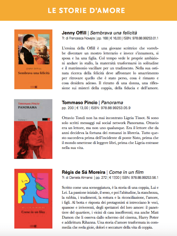 Prima di aggiungere, abbiamo tolto. Alcune delle nostre storie seguivano già percorsi completi in sé e per sé, creavano libri-mondo, o meglio libri-contea: le trilogie di Kent Haruf, di Tom Drury e di Brian Panowich non hanno partecipato al gioco. Ci siamo invece imbattuti nelle storie d’amore di NN: Tommaso Pincio ci ha raccontato l’amore virtuale ma decisivo di Panorama, Jenny Offill la delusione di quel matrimonio che Sembrava una felicità, e poi Régis de Sá Moreira, Come in un film, ci ha fatto riscoprire le emozioni dell’amore quando nasce matura e cresce, nonostante le avversità della vita, attraverso gli occhi degli amanti e di tutti gli spettatori che incontrano sulla loro strada.